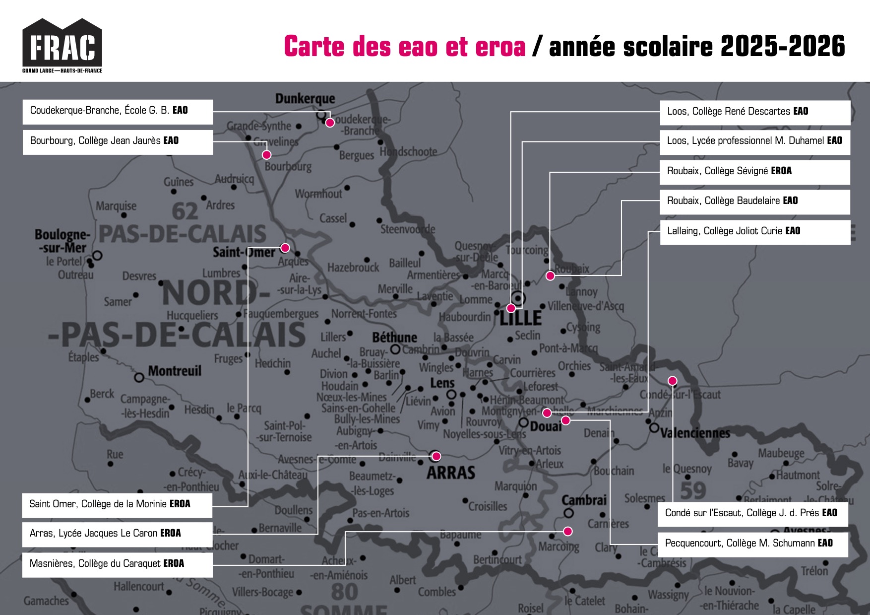Carole Darcy et Emilie Valente, enseignantes missionnées au Frac, proposent des ressources pédagogiques consultables sur le site du Frac et relayées sur le site académique disciplinaire des Arts Plastiques. Parmi ces ressources, les enseignants peuvent télécharger des documents pédagogiques sur les expositions du moment, ainsi que des dossiers pédagogiques sur les œuvres pérennes de la collection.