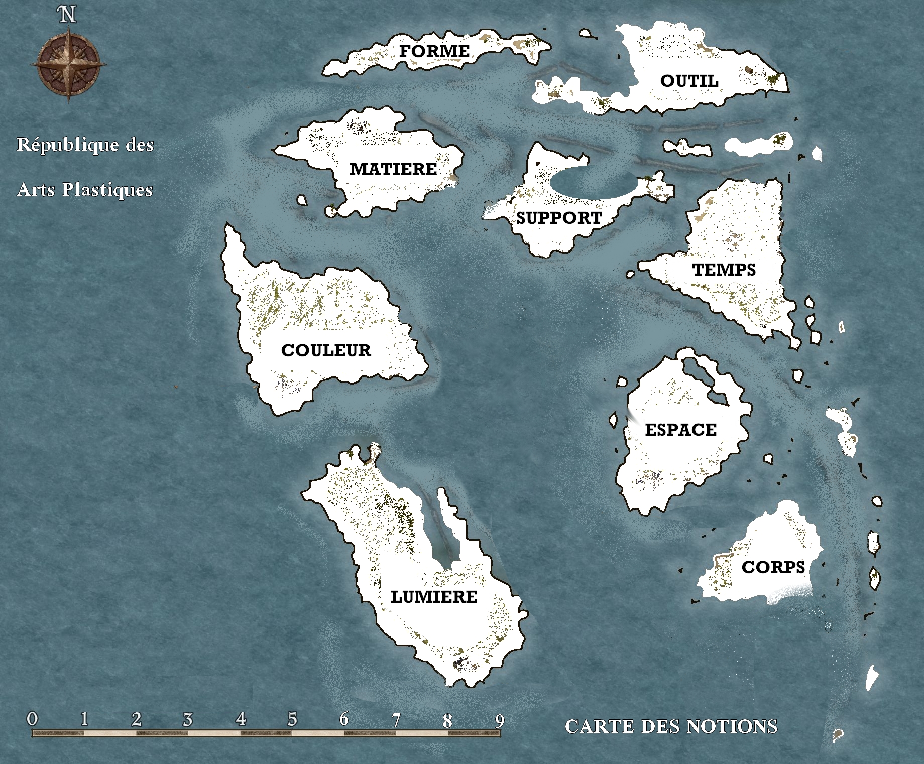 Cette proposition de séquence vise à favoriser l’engagement autonome de l’élève. Le champ de la pratique plastique y est pensé comme un espace cartographié à investir. Ainsi nos 9 notions sont autant de territoires à conquérir et chacun décidera, sur une carte propice à l’aventure, des orientations de son voyage au cœur de la représentation, le point de programme abordé.