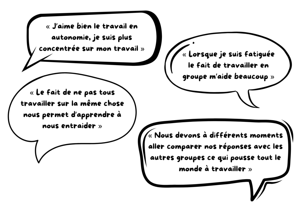 Parfois, la phase de coopération n’intervient pas car l’enseignant est dans une phase d’explications, de transmission de savoirs ou qu’une activité nécessite une étape de réflexion individuelle de la part de l’élève.