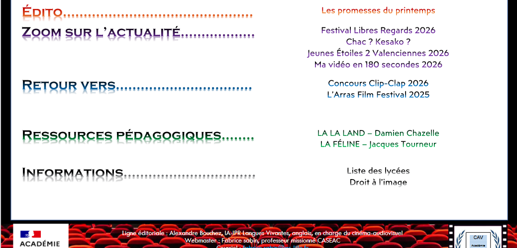 🎬 Bienvenue sur le tout jeune site de l’Académie de Lille dédié à l’enseignement du cinéma et de l’audiovisuel. Mis en ligne début novembre, ce site a été conçu pour vous offrir un accès facilité aux actualités cinématographiques locales et institutionnelles, aux textes officiels, ainsi qu’aux ressources pédagogiques destinées à accompagner les enseignants. Les textes et ressources sont également consultables sur Eduscol.