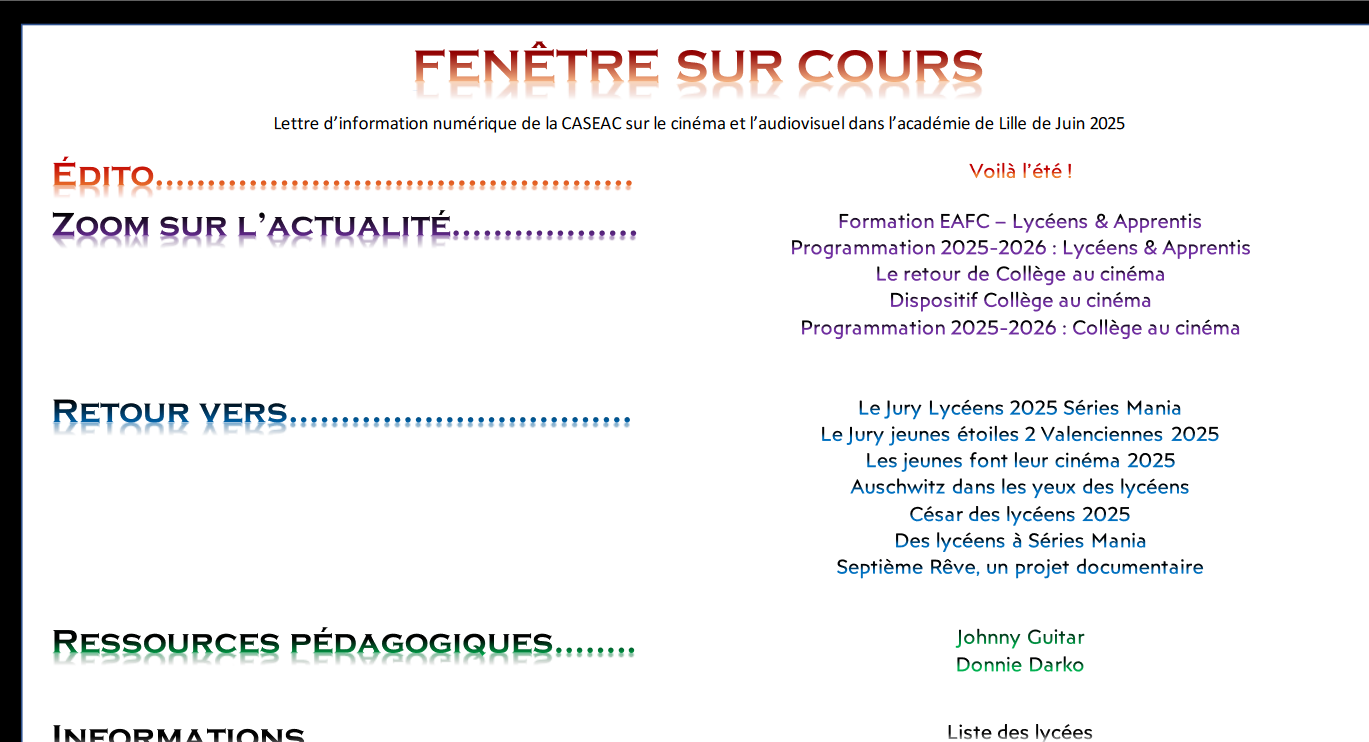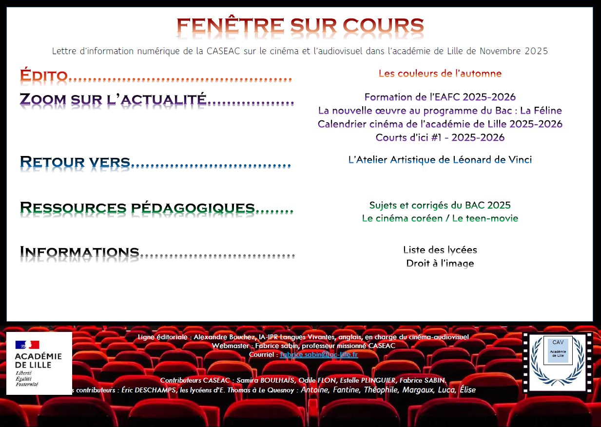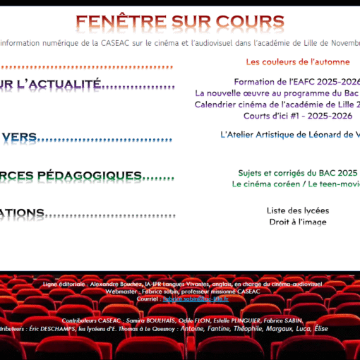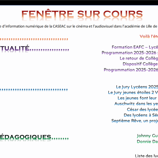 PubliĂ© 9 novembre 2025 đ°FENĂTRE SUR COURS juin 2025 Lettre dâinformation numĂ©rique de la CASEAC sur le cinĂ©ma et lâaudiovisuel dans lâacadĂ©mie de Lille Juin 2025.