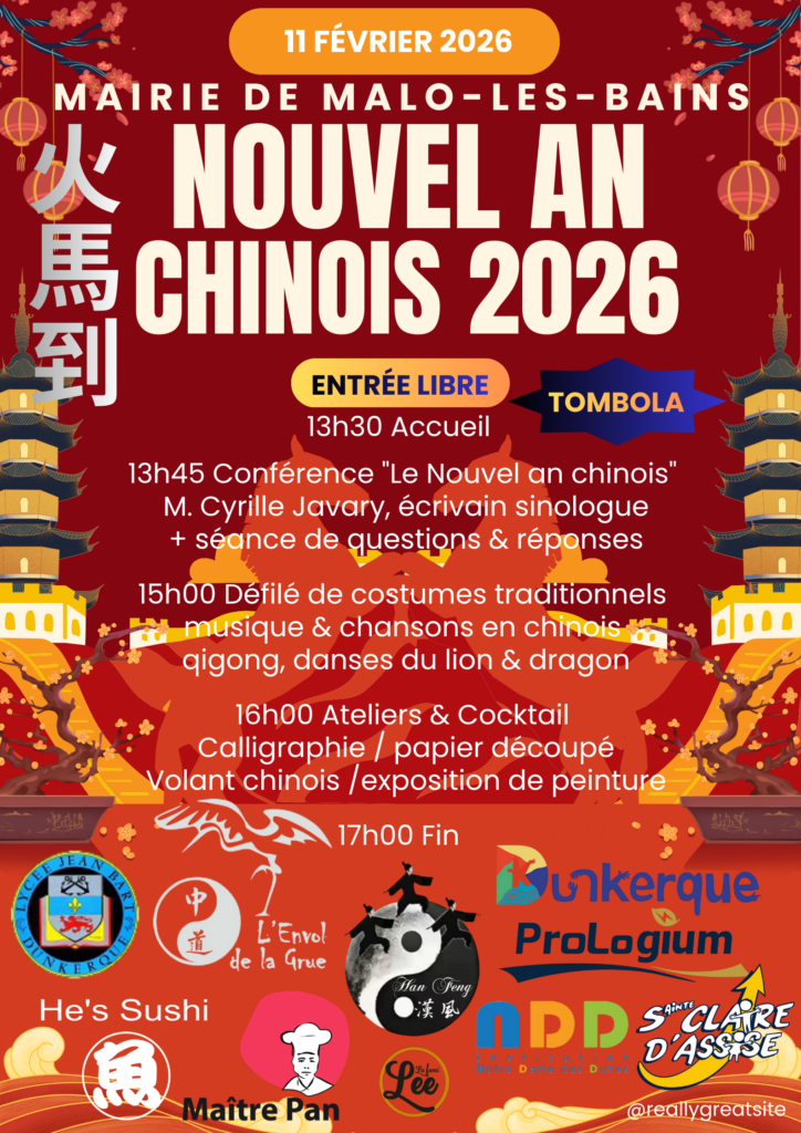 Le mercredi 11 février prochain en mairie de Malo-les-Bains (Dunkerque) se tiendra entre 13h30 et 17h00 un événement grand public lié au Nouvel An chinois. Le lycée Jean Bart et ses partenaires (lycée Notre-Dame-des-Dunes, entreprise ProLogium, associations Hanfeng & L’Envole de la grue) proposeront au grand public un programme alliant culture et divertissement pour célébrer l’année du Cheval de feu. L’événement s’inscrit pleinement dans la continuité de nos enseignements et a pour vocation d’en faire la promotion.