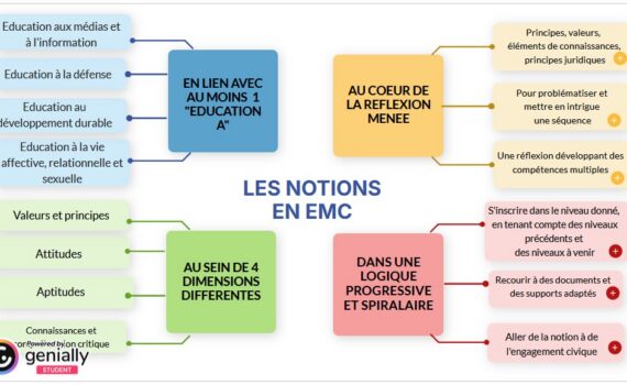 Dans le nouveau programme d’EMC, l’approche par notions est centrale. L’infographie ci-dessous a été conçue pour mettre en perspective le programme et favoriser cette approche par notions. https://view.genially.com/6910acdddb7217eb7eac7071/interactive-content-copie-les-notions-en-emc