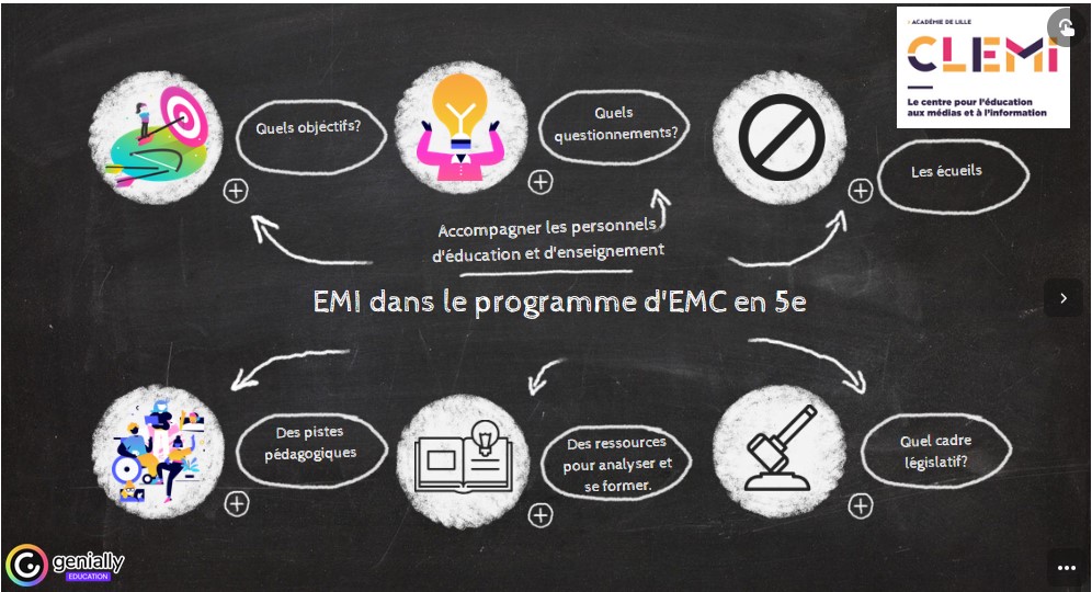 Le CLEMI de l’académie de Lille propose des ressources genially pour accompagner dans la mise en oeuvre du volet EMI des nouveaux programmes d’EMC de la 5ème à la seconde.