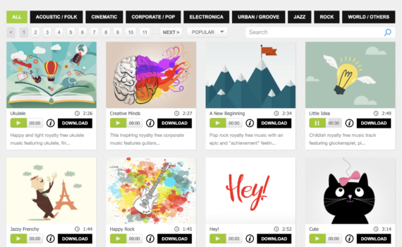 Banque de musiques d’ambiance qui propose un grand nombre de musiques gratuites. Il faut néanmoins citer la source dans votre montage : Music : www.bensound.com ou Royalty Free Music from Bensound