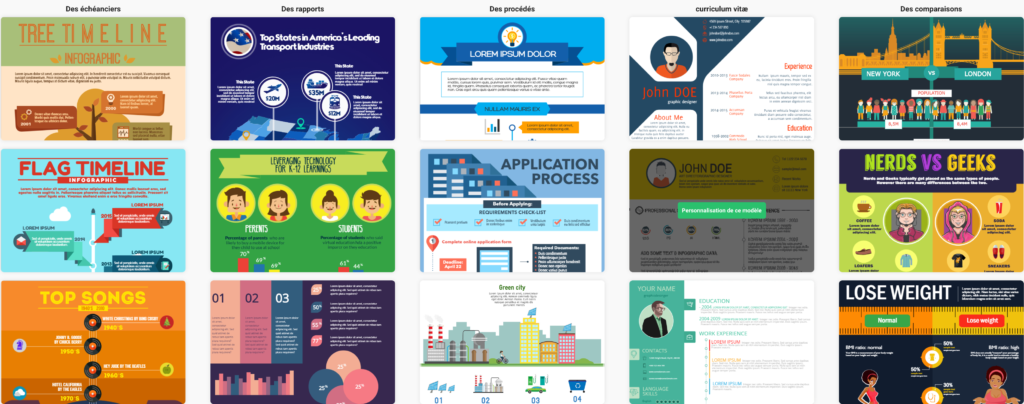 Piktochart permet de créer des infographies, des posters, des rapports, des présentations à partir d’une base étendue de modèles prêts à servir que vous pourrez ensuite entièrement personnaliser en fonction de vos besoins.