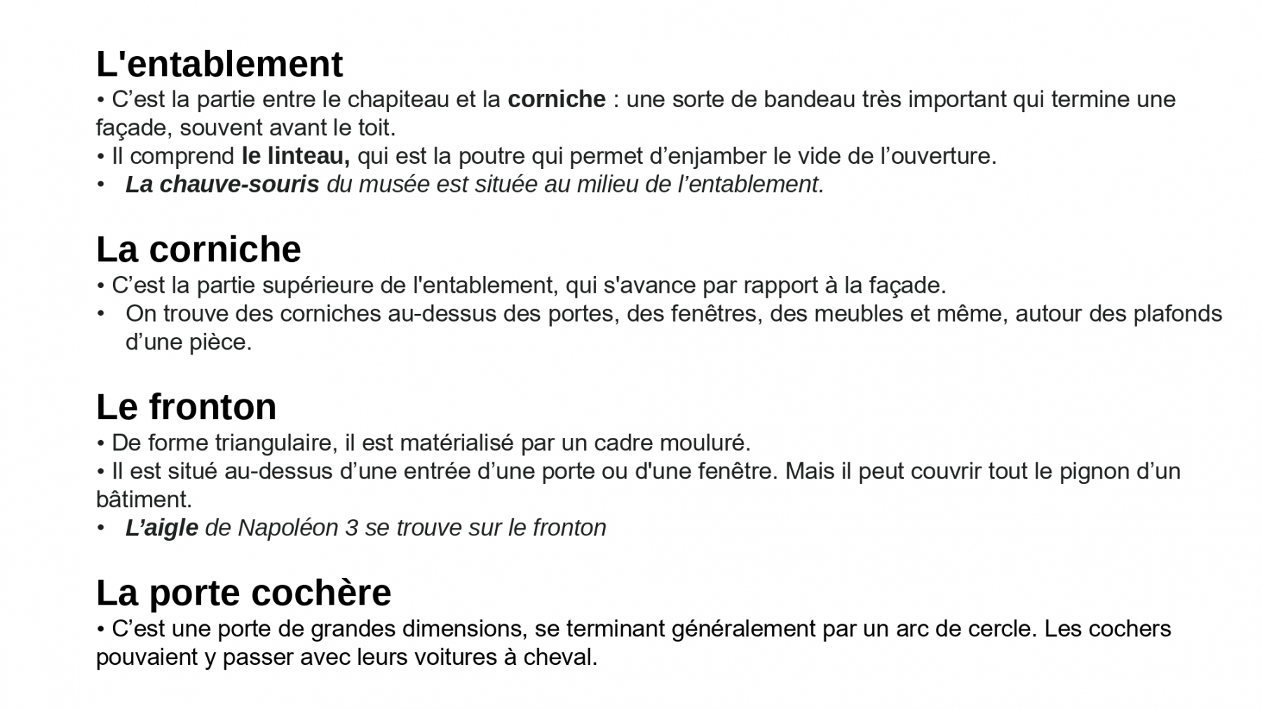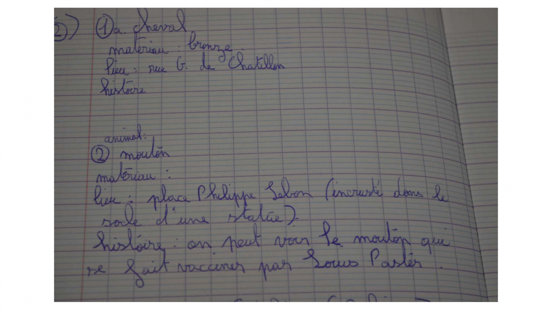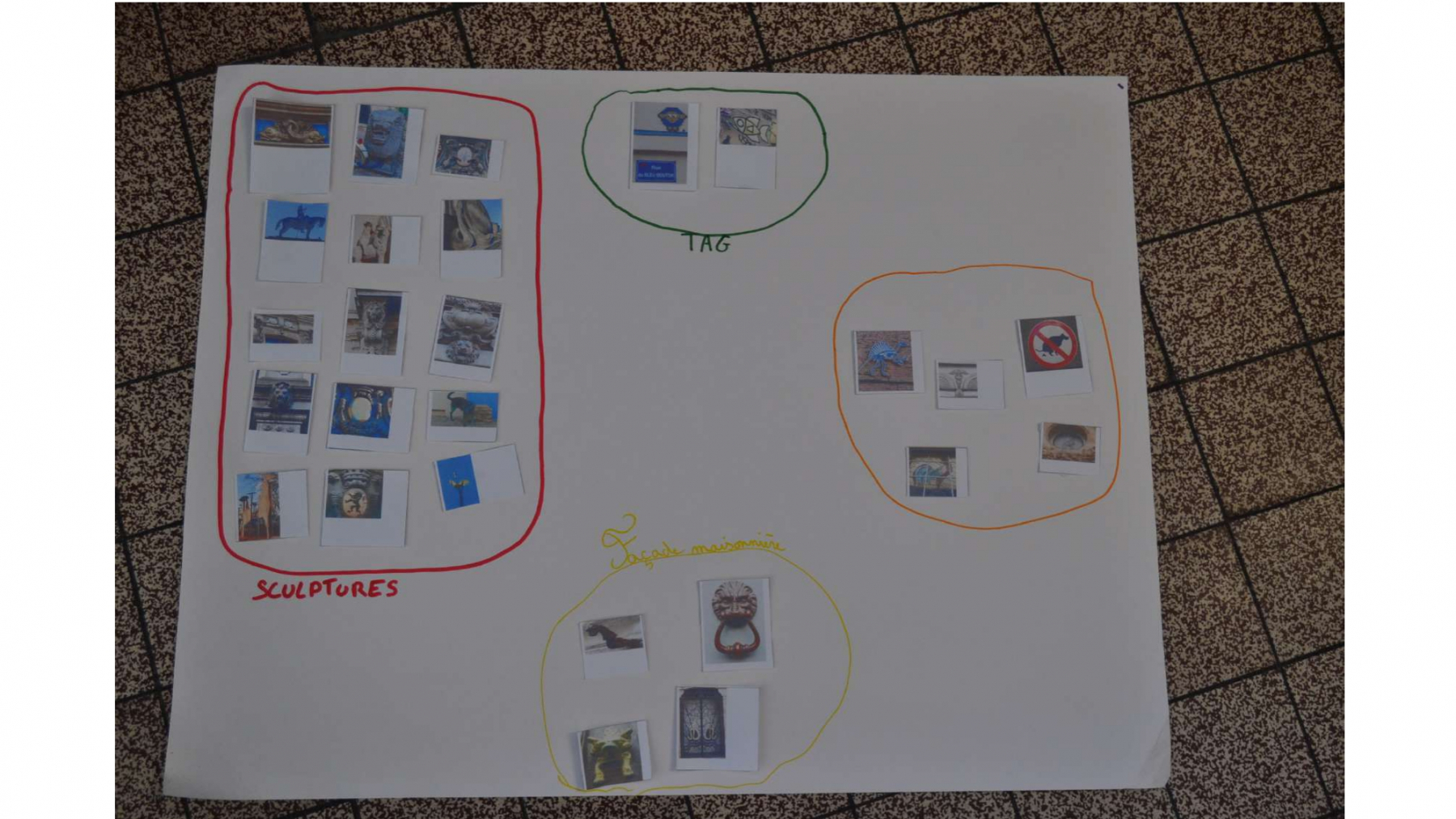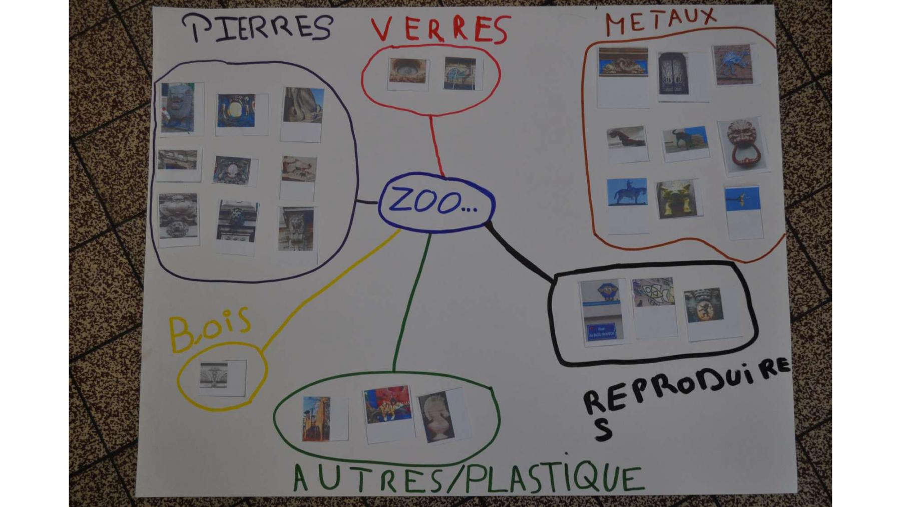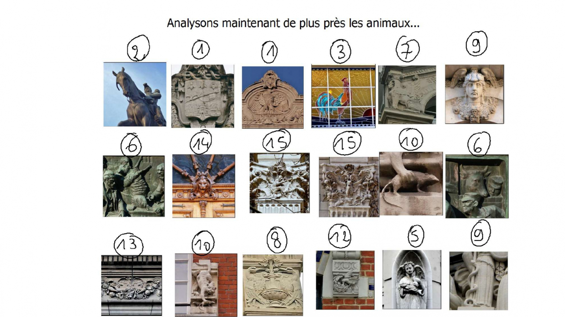 - Catégorisation par les élèves avec le recours à un lexique précis : animaux représentés, matière, fonction (utilitaire pour le bâtiment – heurtoir par exemple – ou décoratif; animal utilitaire pour l’homme – cheval pour voyager par exemple), emplacement (façade, environnement…), époque, échelle (réaliste ou non, etc.), caractère narratif, rapport de l’animal à l’homme, hybridité, humanisation, lien avec la mythologie, émotion ressentie par l’animal (colère…) et le spectateur, etc.