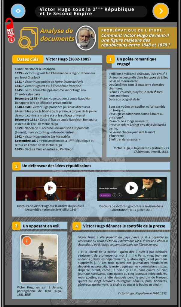Objectifs : Comprendre comment Victor Hugo est devenu l’une des références majeures des républicains en raison de son évolution politique sous la Deuxième République et de sa lutte de proscrit puis d’exilé volontaire contre le Second Empire.