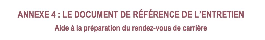 L’entretien permettra d’échanger sur les différents items contenus dans le « document de référence de l’entretien », document d’aide à la préparation du rendez-vous de carrière inséré en annexe du guide de l’évaluation.