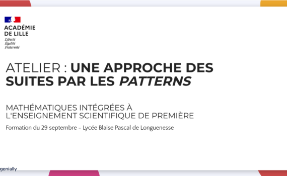 Le diaporama : Les ateliers : Quelles pratiques pour travailler l’enseignement spécifique des mathématiques ? Quelques illustrations autour des modèles affines Une approche des suites par les patterns.