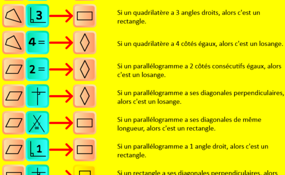 Le principe : construire des quadrilatères particuliers à l’aide de leurs caractéristiques. Pour cela, il faut juxtaposer une pièce « Propriété » à côté d’une pièce « Quadrilatère », l’objectif final étant de créer des pièces « Carré » contiguës afin de marquer le maximum de points. Lien vers le jeu