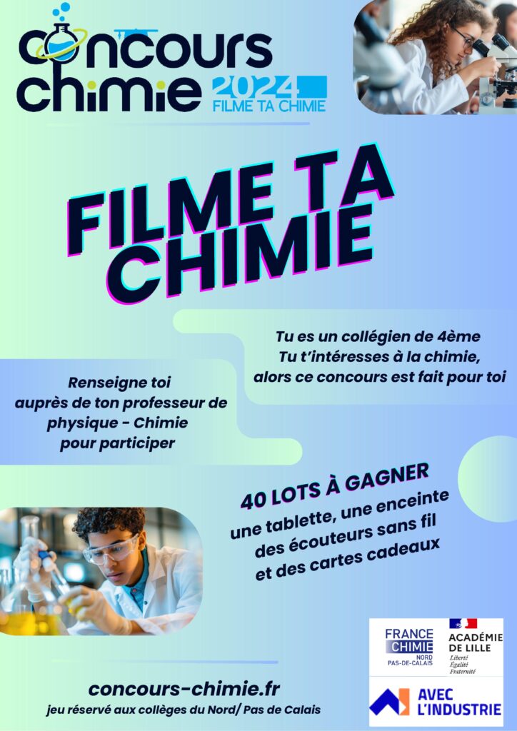 Vous trouverez ci-dessous l’affiche du concours « Filme ta chimie », il se fait en collaboration avec France chimie Nord-Pas-de-Calais.