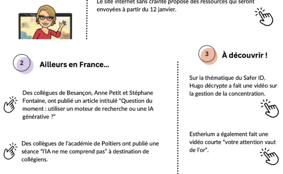 Le premier numéro de 2025 est sorti ! On y découvre notamment un sondage sur l’IA réalisé par le GEP Documentation de l’académie de Versailles et un guide québécois pour des pratiques pédagogiques éthiques avec l’IA. Des astuces sont également présentées, comme l’utilisation de l’outil MyMarkMap pour créer des cartes mentales à partir de textes Markdown générés avec IA. Vous y croiserez aussi un article des professeurs de lettres de l’académie de Versailles qui analyse l’utilisation par les élèves des IAG pour faire leurs devoirs, et vous rencontrerez une fresque sur l’économie des médias partagée par des collègues de l’académie […]