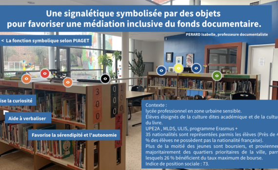 Isabelle Pérard, professeure documentaliste au lycée professionnel Aimé Césaire de Lille, nous partage un support expliquant sa démarche autour de la signalétique. Dans une démarche inclusive, elle utilise des objets pour symboliser le fonds documentaire.
