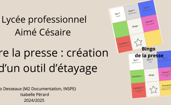 Théo Desseaux, étudiant en M2 Documentation et en stage au lycée professionnel Aimé Césaire avec Isabelle Pérard, propose une séance sur la presse. Contexte : le « Bingo de la presse » a été élaboré dans le cadre d’une séance collaborative entre le professeur documentaliste, un professeur de lettres et un groupe d’élèves de CAP électricité, afin de développer leurs compétences en lecture et en analyse critique de l’information. Public : une classe de CAP. Objectifs : aider les élèves, notamment allophones, à lire et analyser un article de presse de manière méthodique, en s’appuyant sur les principes des neurosciences pour améliorer leur compréhension […]
