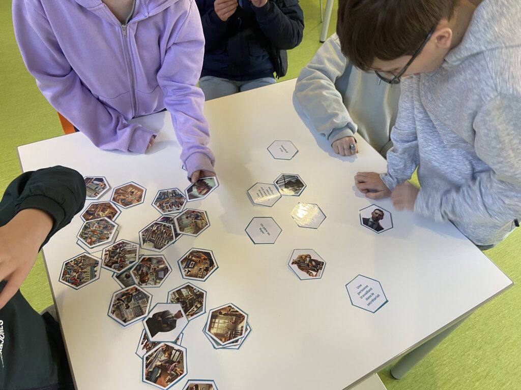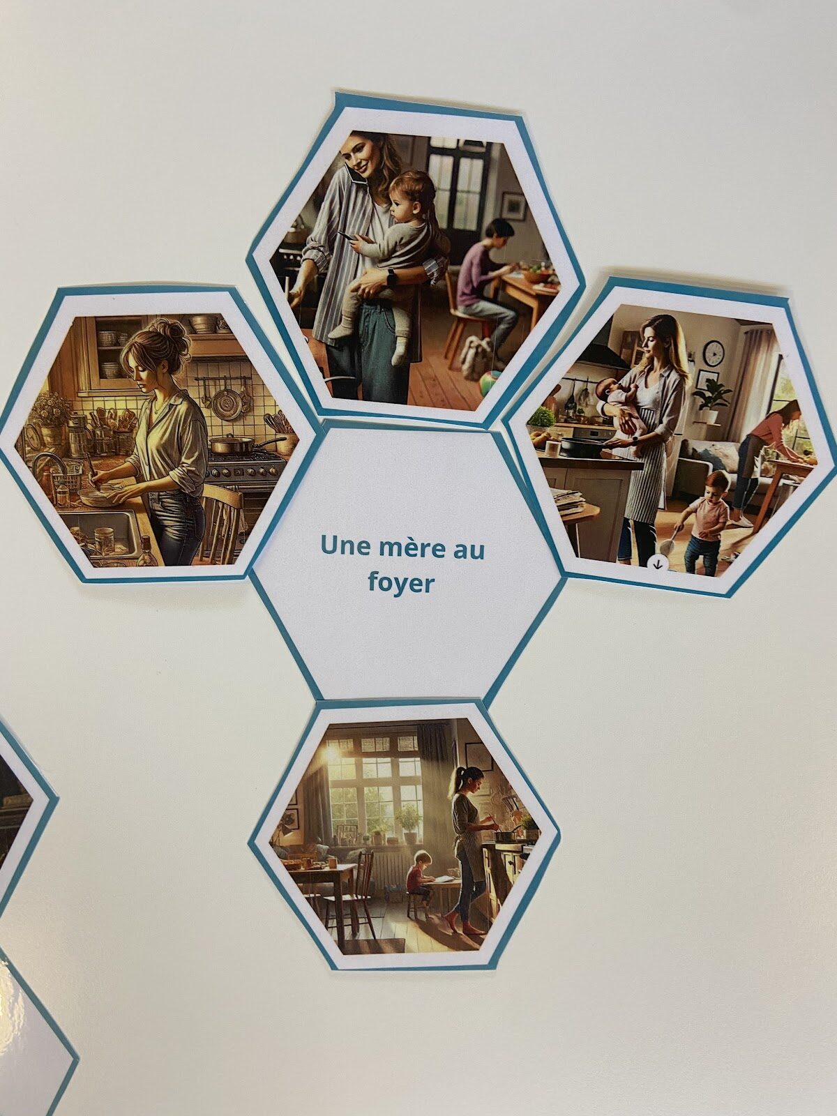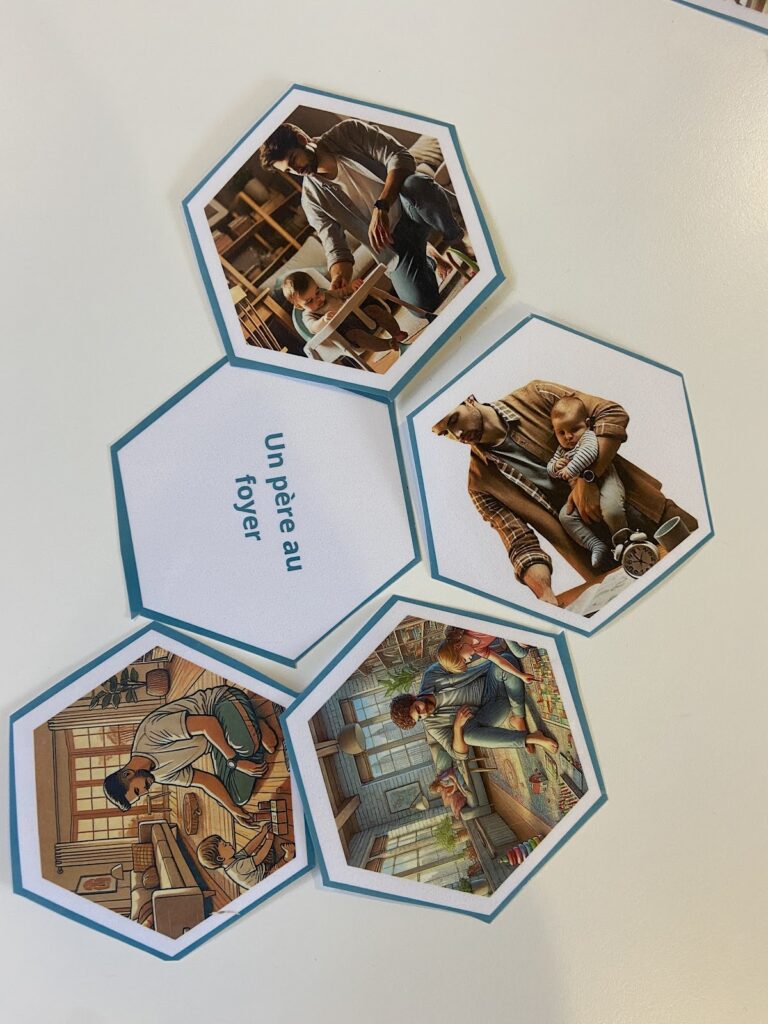| Il s’agit d’un jeu de cartes en forme d’hexagones où le but est d’associer des mots (par exemple ici “une mère au foyer”, un père au foyer”, “une personne travaillant dans le secrétariat”, “une personne dirigeant une grosse entreprise”…) avec des images (ici générées par IA à partir des mots ci-dessus). Il n’y a pas de bonnes ou de mauvaises réponses : le but étant de faire verbaliser et réfléchir autour d’une thématique particulière. Jeu réalisée par Mélanie Serret, professeure-documentaliste au lycée Giraux-Sannier de Saint-Martin-Boulogne |