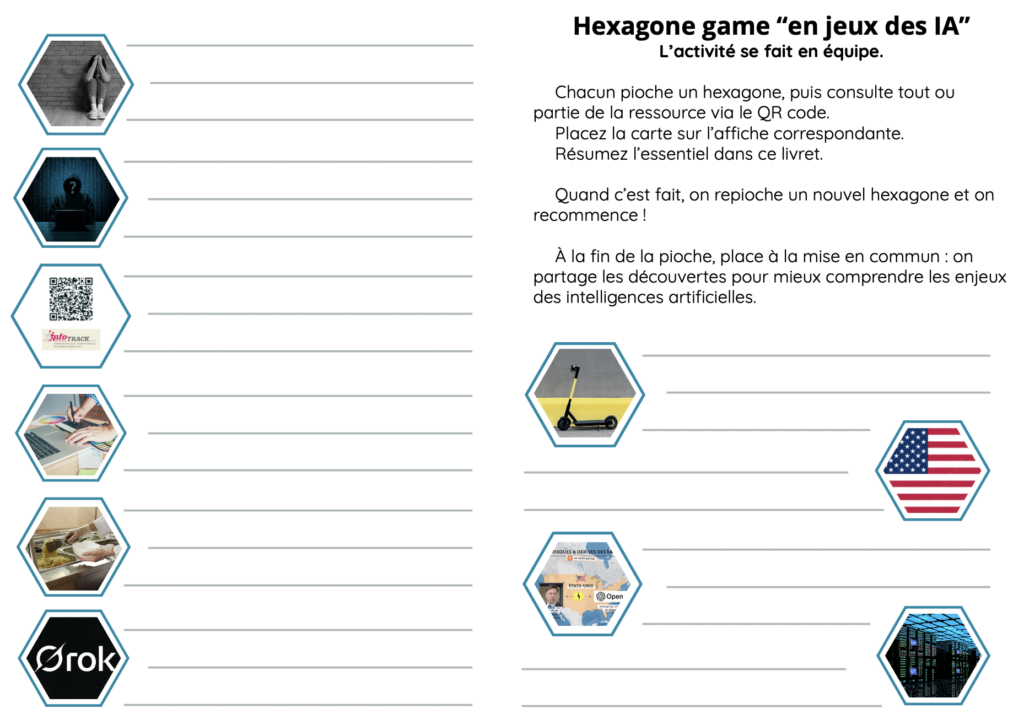 Les élèves travaillent en équipes de trois ou quatre. Ils disposent des panneaux de l’exposition (imprimés au format A4), disposées sur les tables, ainsi que d’un jeu de cartes organisé en pioche centrale. Ces cartes renvoient à des ressources variées (articles, vidéos, contenus accessibles via QR codes). Chaque élève dispose également d’un carnet de prise de notes.
