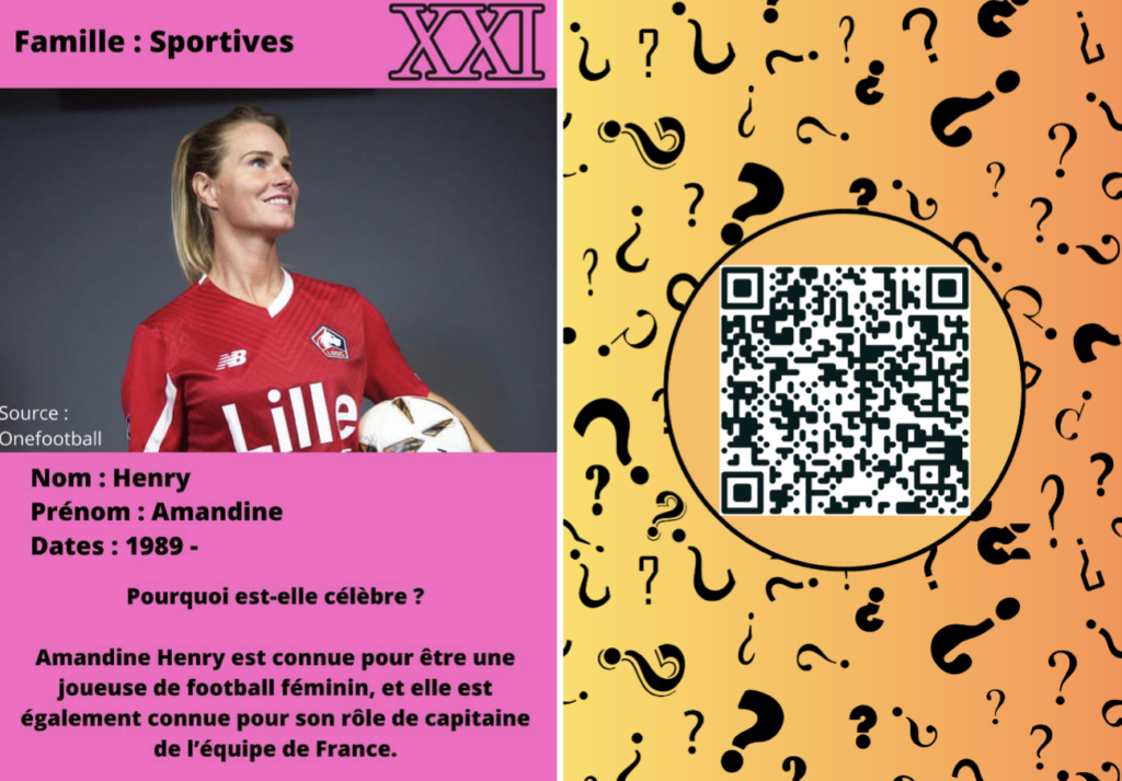 Dans le cadre de l’engagement du lycée dans la labellisation Egalité filles – garçons, ce projet, reconduit pour la 3e année au lycée a permis de réaliser un jeu des 7 familles de femmes inspirantes ayant marqué l’histoire dans différents domaines (les familles : littérature, science, sport, politique, histoire…), de façon différente (les catégories : engagée, pionnière, reconnue, oubliée…).