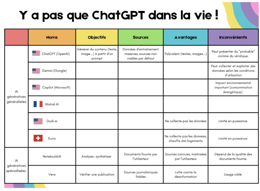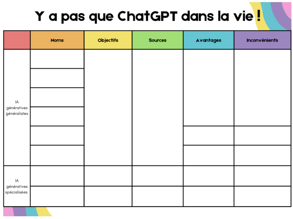 Durant une trentaine de minutes, une activité bilan est proposée aux élèves pour faire le point sur les IA qu’ils connaissent et ce qu’ils savent d’elles. Cette activité permet de faire un point d’étape après plusieurs activités (en seconde en SNT, en EMI, en SVT…), participant ainsi à la mise en place d’un parcours progessif d’acculturation aux IA.