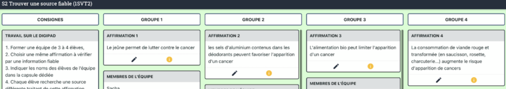 Les élèves ont choisi un sujet dans un digipad. Par équipe de 3 ou 4, chacun doit trouver une publication, l’analyser via le fiabilitomètre pour la présenter à l’oral à la séance 2.