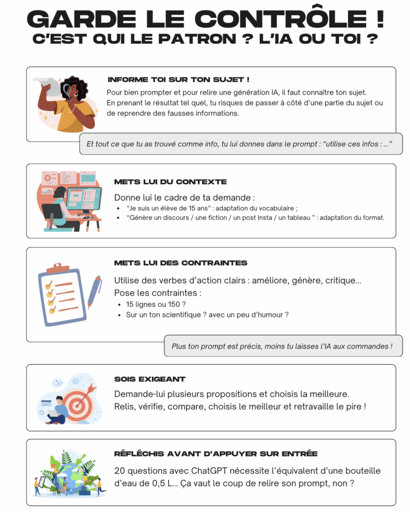 Les élèves disposent alors de 10 minutes pour rédiger un prompt le plus complet possible pour générer un texte de présentation, mettant en avant les problèmes mais surtout les solutions que certains agriculteurs mettent en place, et une dizaine de questions d’interview. Pour aider les élèves à prompter, les élèves disposent d’une fiche outil. Les élèves impriment ensuite leur prompt et la génération.