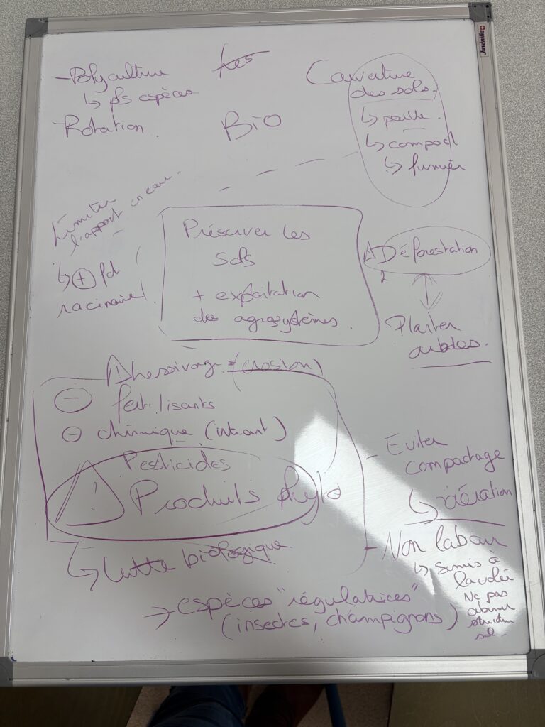 Les élèves doivent ensuite réaliser, en équipe de 4, un schéma bilan montrant le fonctionnement de l’agrosystème étudié lors de la sortie avec les solutions proposées par les agriculteurs pour chaque problématique de reportage.