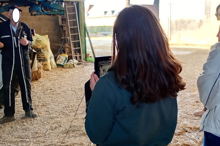 L’accueil à la ferme est organisé de sorte à permettre un temps d’interview des agriculteurs. Les équipes de 8 élèves de la séance précédente sont conservées. Chaque équipe dispose d’une tablette et d’un micro-cravate pour réaliser les interviews. Chaque élève a un rôle au sein de l’équipe : 2 élèves posent les questions, 2 élèves filment, 4 élèves prennent des notes des réponses des agriculteurs. Des logiciels de montage (Capcut, Imovie) sont intégrés dans les tablettes ce qui permet de monter directement les vidéos. Chaque équipe doit produire une vidéo de 5 minutes avec l’essentiel des solutions proposées par les exploitants agricoles face à la problématique de leur sujet.