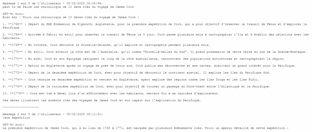 Utilisation de Duck Duck Go AI (pour rappel, cet outil ne nécessite pas de création de compte et permet le téléchargement des échanges entre l’élève et l’outil). Les élèves ont d’abord demandé un résumé en 10 dates de l’exploration. Ils ont ensuite comparé la date de début et la date de fin avec le corpus créé par les enseignants.