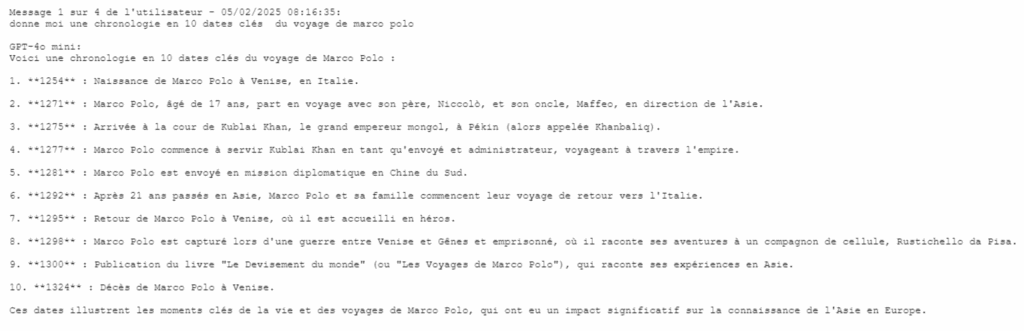 Dans cet exemple, l’IA propose des dates correspondantes à la vie de Marco Polo et non uniquement à son exploration. Les professeurs vont pouvoir juger le prompt suivant pour vérifier que l’élève a fait une relecture critique de la génération.