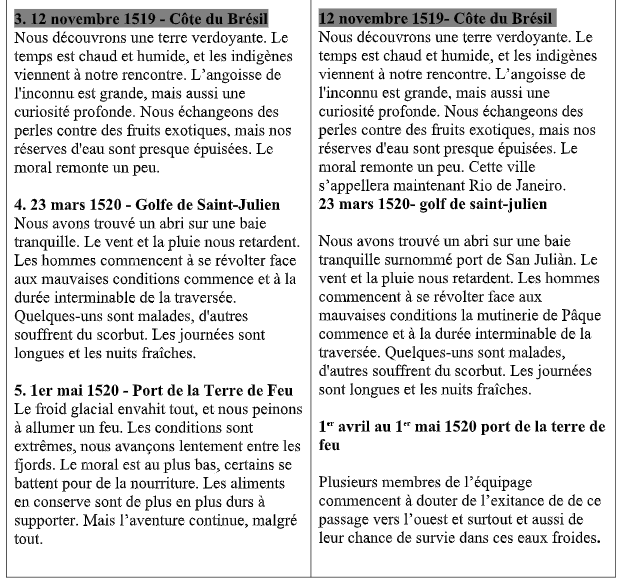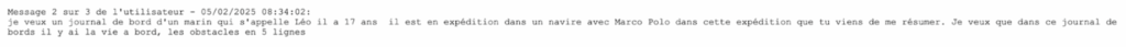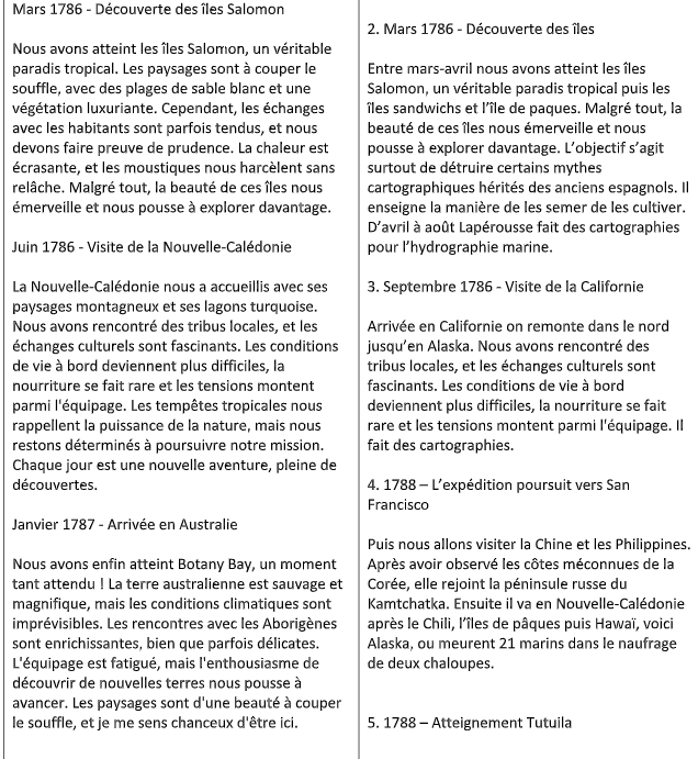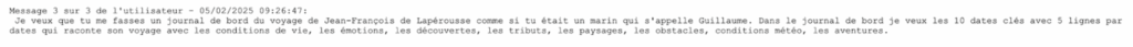 Cette étape permettait de vérifier que les élèves avaient suffisamment précisé leur prompt pour obtenir une génération de texte sur la bonne exploration (par exemple, James Cook a fait 3 explorations et par conséquent chaque binôme travaillait sur une exploration différente).