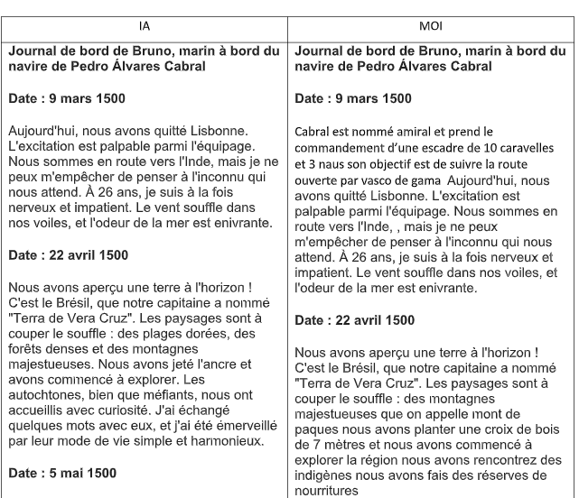 Les élèves vont ensuite copier-coller le journal de bord obtenu avec l’IA dans une colonne et ils vont devoir proposer des améliorations dans une seconde colonne, à l’aide des corpus élaborés par les enseignants.
