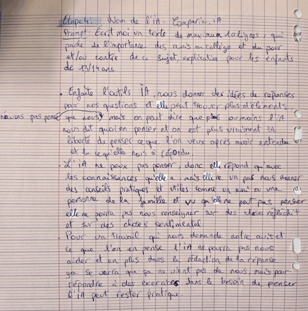 Après une phase de découverte et d’écriture de prompt, les élèves ont fait générer par un outil basé sur l’IA un texte sur le même sujet. Ils se sont rendus compte que le prompt devait être travaillé et assez précis : s’ils oubliaient de préciser un public destinataire le vocabulaire était parfois trop complexe pour certains des sujets, et s’ils omettaient de préciser qu’il fallait une réponse de 10 lignes certains se sont retrouvés avec une réponse d’une seule phrase quand d’autres avaient une réponse de plusieurs dizaines de lignes…