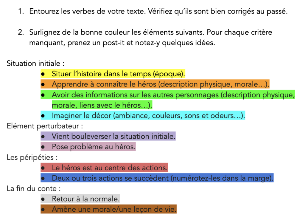 - Impression des contes et relecture par les élèves. Ils surlignent les éléments de notre liste pour vérifier la structure. Selon les situations, ils répondent à quelques questions que nous avons posées pour les aider à s’interroger sur la cohérence de l’histoire. Un travail sur le vocabulaire aurait pu être envisagé ici. Les élèves notent leurs nouvelles idées en mots clés sur des post-its (par exemple : décrire le héros, c’est un 4×4 de couleur bleu, il est neuf et très rapide). Ici, cette étape a été possible grâce à un nombre d’élèves très limité. Nous souhaitons reproduire ce projet avec des effectifs plus importants et c’est dans ce cadre que nous avons testé des agents conversationnels (voir plus bas).