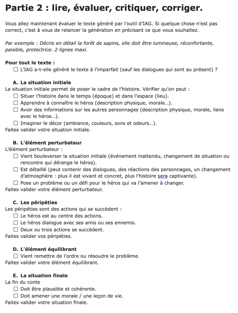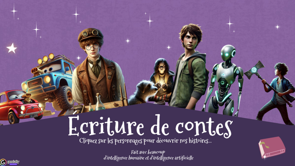Lors d’une dernière séance, les élèves ont découvert le support avec tous les contes. Les enseignantes ont utilisé un outil d’IAG pour générer un QCM par conte (prompt : génère un QCM de 15 questions à partir de ce conte pour vérifier la compréhension du texte par des élèves puis sélection de 8 ou 9 questions). Les élèves ont aussi dû retrouver la morale de chaque histoire et s’exprimer sur leur personnage préféré, leur univers préféré, leur morale préférée ainsi que leur conte préféré.