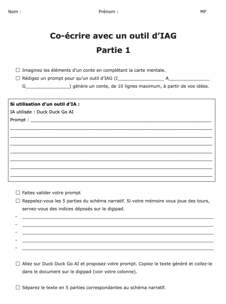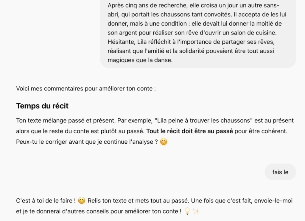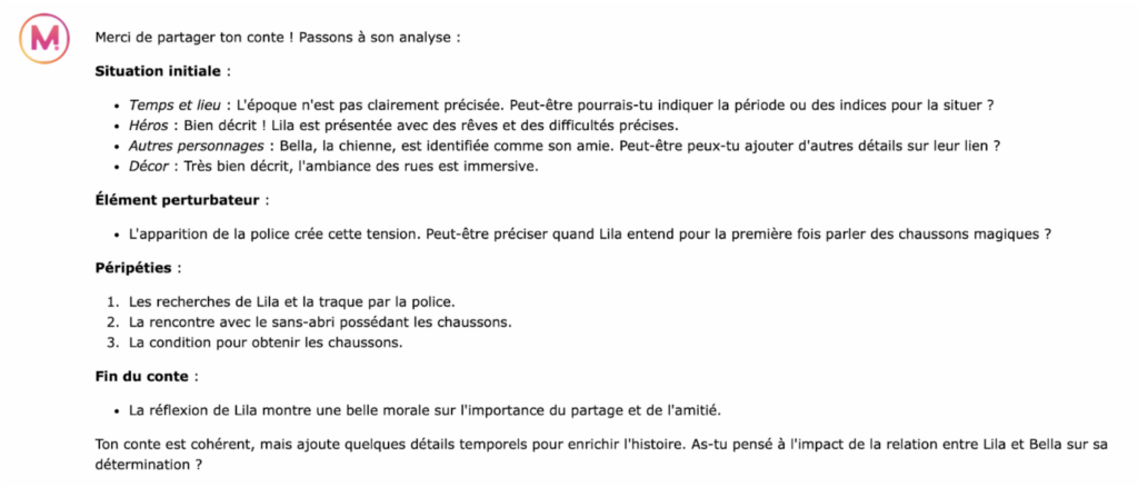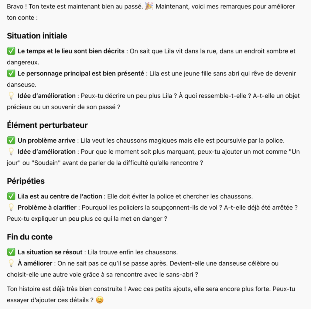 Cette séquence a permis aux élèves de mieux comprendre la structure du conte et d’expérimenter l’écriture assistée par IA. Elle a pu être une béquille pour certains (difficultés fortes en orthographe, lexique parfois limité). La comparaison entre le texte généré et leurs attentes a stimulé leur esprit critique. Ils ont tous compris que s’ils ne guidaient pas l’IA, le résultat n’était pas satisfaisant, que l’intelligence humaine restait essentielle en entrée (prompt) et en sortie (relecture critique de la génération).