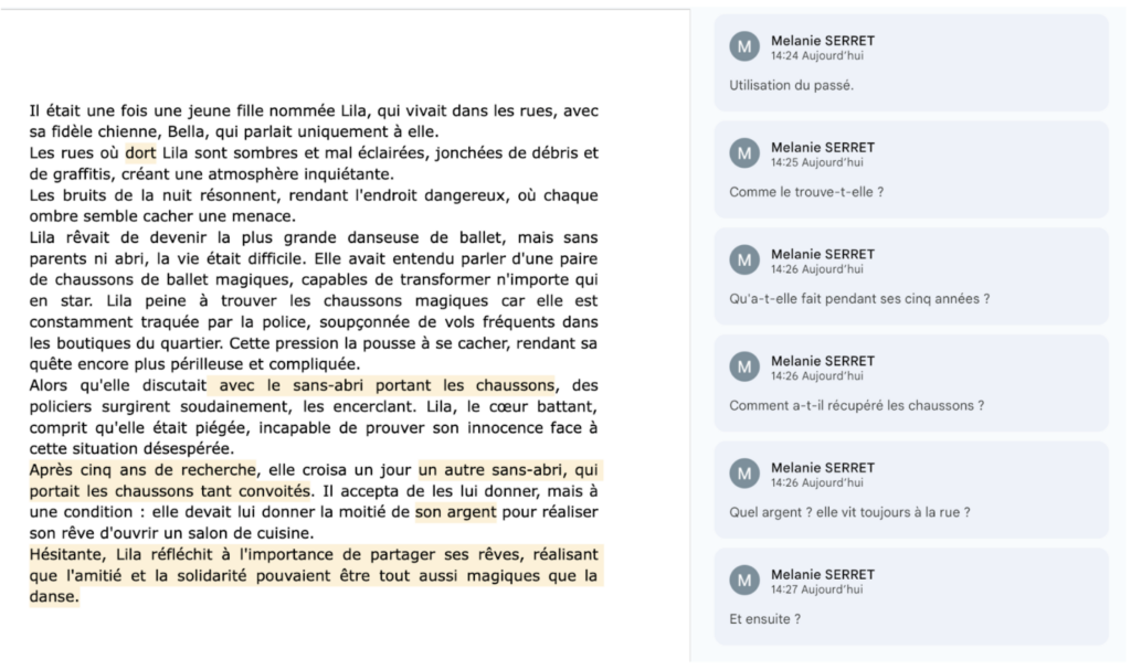 Néanmoins, certains élèves peinent à réaliser le manque de cohérence de leur histoire. Une piste pourrait être la relecture collaborative mais nos élèves ne sont pas prêts à une telle exposition aux autres. C’est pourquoi nous envisageons de tester des agents conversationnels.