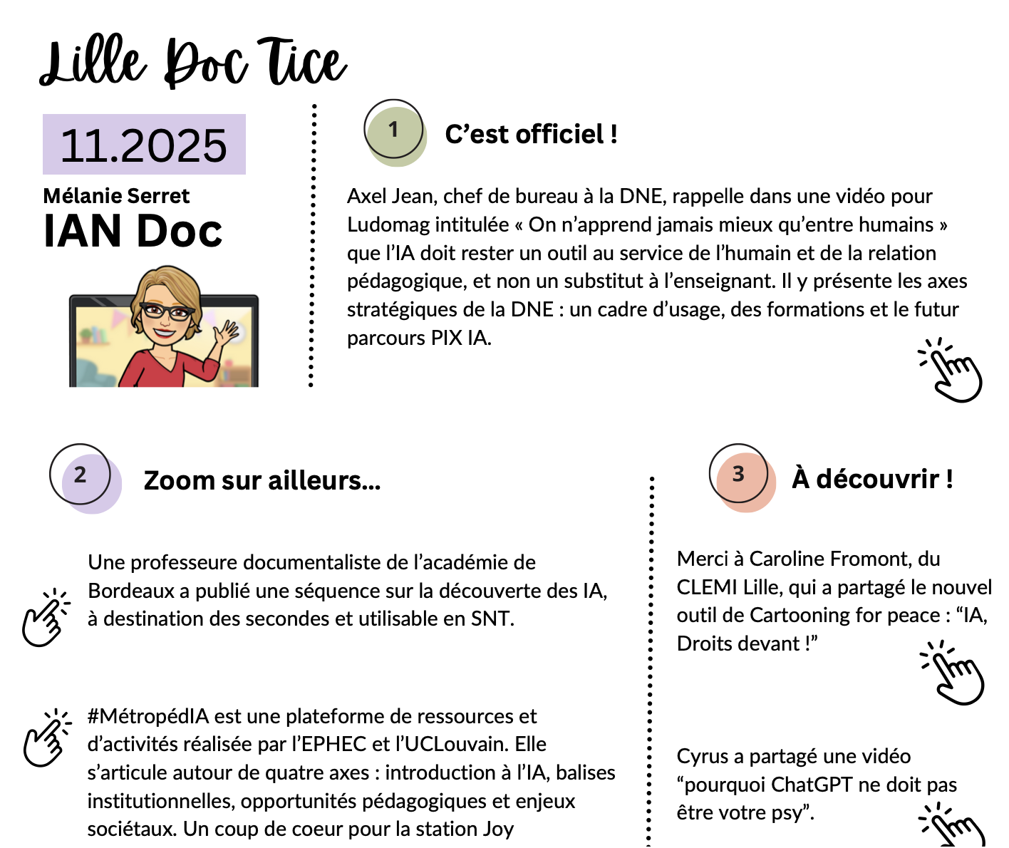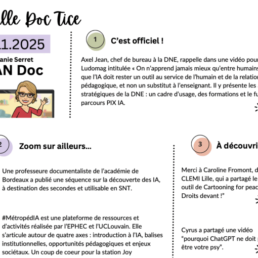 Dans ce numéro de Lille Doc Tice, on retrouve le cadrage ministériel sur l’IA en affiche, des scénarios pédagogiques proposés par des collègues d’autres académies et quelques ressources sur les réseaux sociaux et les algorithmes de recommandation. Bonne lecture, et bonne rentrée !