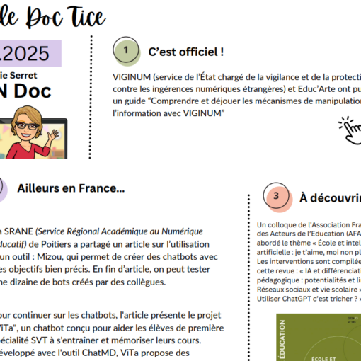 Dans ce numéro de Lille Doc Tice, on découvre des séances pédagogiques sur l’IA et sur l’information scientifique, une expo sur l’IA par Cartooning for Peace, la plateforme MétropédIA ou encore Lumo, une IA européenne respectueuse des données. Belles découvertes !