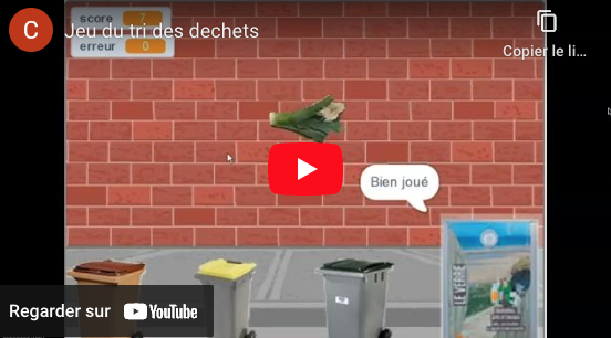Production finale : chaque élève a réalisé son jeu de tri des déchets sous Scratch. Ils ne sont pas publiés. Une vidéo réalisée à partir d’un écran d’ordinateur permet de montrer un exemple.
