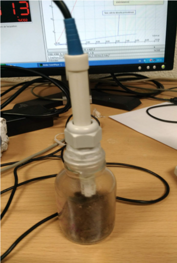 Au bout des 10 minutes (nécessaires pour éviter la saturation des sondes CO2), les sondes sont placées simultanément dans les flacons hermétiquement fermés (utilisation de téflon au niveau du presse-étoupe inséré dans le bouchon percé).