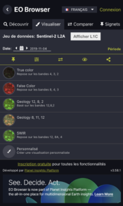 EO Browser est un outil développé par l’Agence spatiale européenne (ESA) permettant d’accéder et de visualiser les données des satellites Sentinel. Il propose des fonctionnalités de visualisation et d’analyse de données très complètes.
