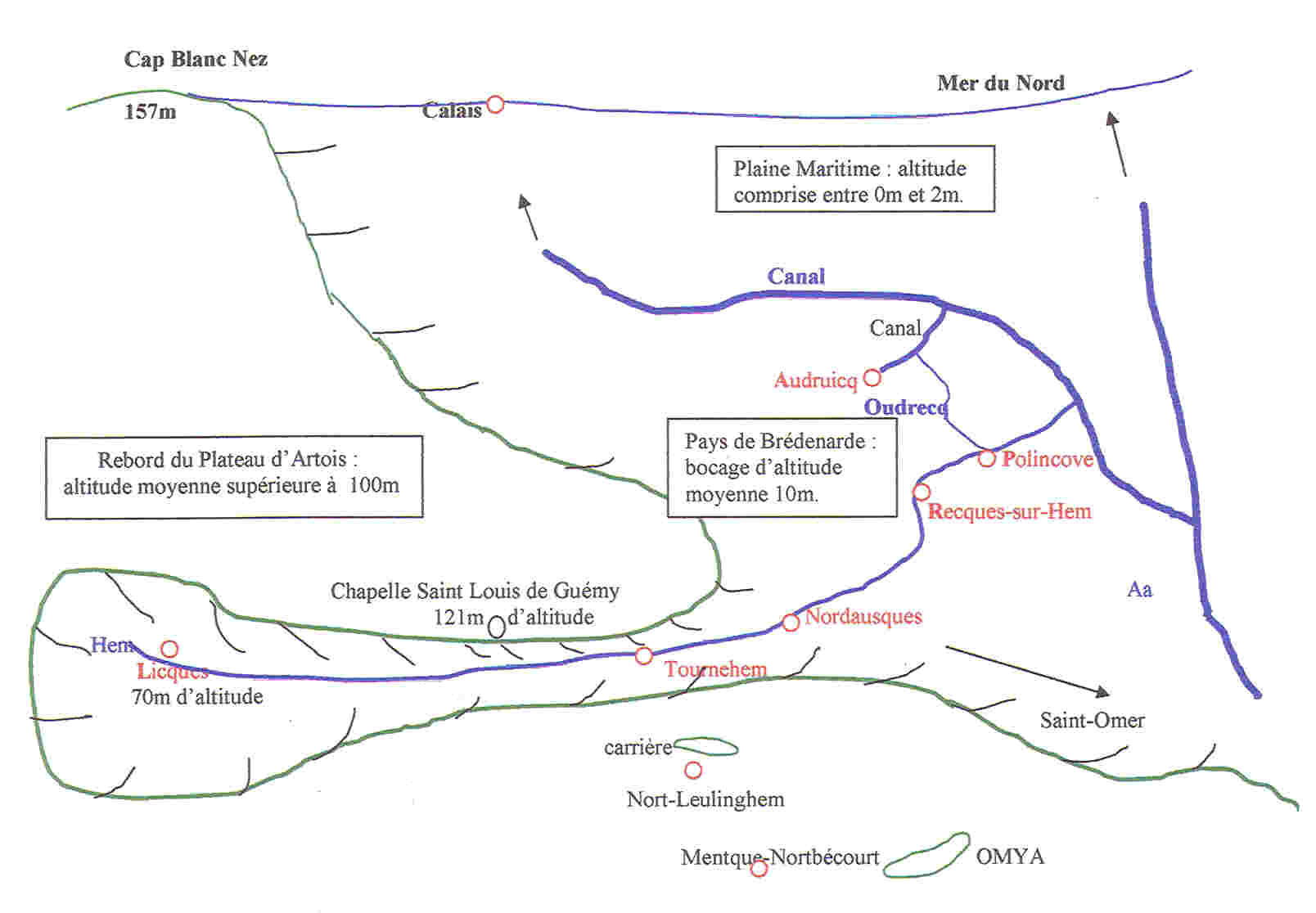 -Durant le trajet vers Tournehem, on peut observer une ligne de hauteurs qui domine Recques et Polincove, ainsi que le sud du Brédenarde : elle délimite les abords du plateau d’Artois.  Sur place, on peut constater que les pentes y sont plus fortes, les champs plus secs et l’herbe des pâturages moins verte, sauf en fond de vallée.