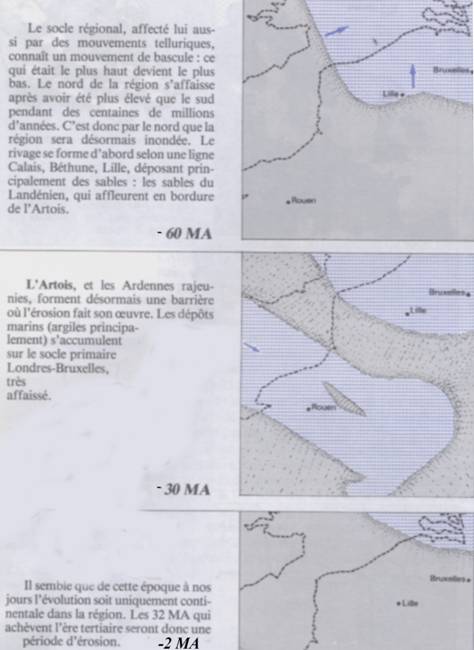 Ci-dessous quelques données issues de l’Université des Sciences et Techniques de Lille (d’après Colbeaux, Debuyser…) et d’une brochure  illustrant la paléogéographie de la zone à la fin du Crétacé :