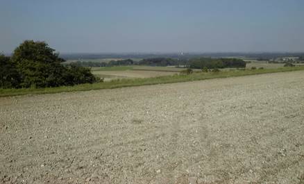 • Au premier plan, rebord du plateau d’Artois, avec ses champs secs au sol érodé qui laisse apparaître la craie du sous-sol.
