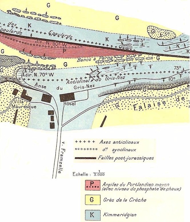 Extrait de la « Carte géologique de la plage du Gris-Nez » – Bulletin des Services de la Carte géologique détaillée de France et des Topographies souterraines – Bulletin n° 156. T. XXVIII (1923 – 1924). Pl. II par P. Pruvost.