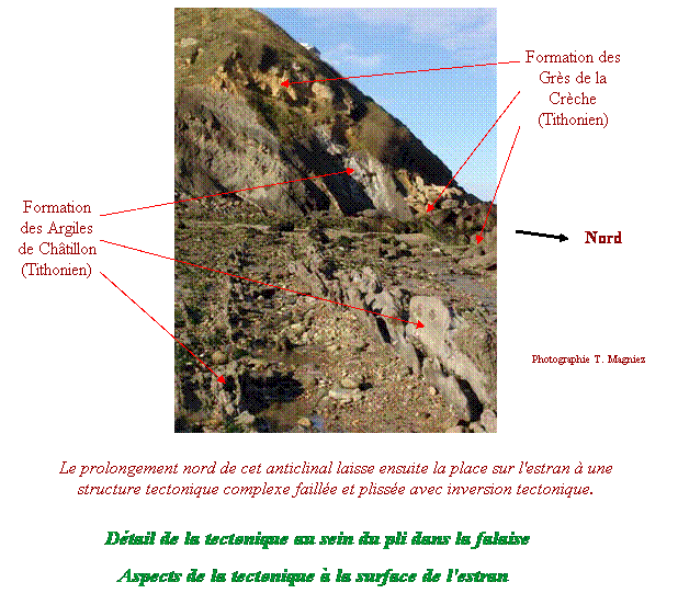 Les plis visibles sur la plage (terminaisons périclinales bien visibles) sont dissymétriques et recoupés par des failles qui, latéralement deviennent parallèles à la stratification et disparaissent sous le sable.