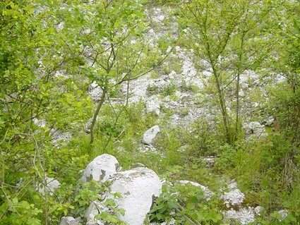 L’endroit qui nous intéresse est le parking le plus éloigné de l’entrée de la coupole. Ce parking est réservé aux voitures, et montre un bel affleurement calcaire de plusieurs dizaines de mètres. Par repérage sur carte, on peut comprendre que l’on se trouve sur les flancs du plateau des Landes. Ici, l’eau est peu présente et en conséquence la végétation peu développée. Des manipulations sur des échantillons de craie sont alors possibles (influence des propriètés des roches).